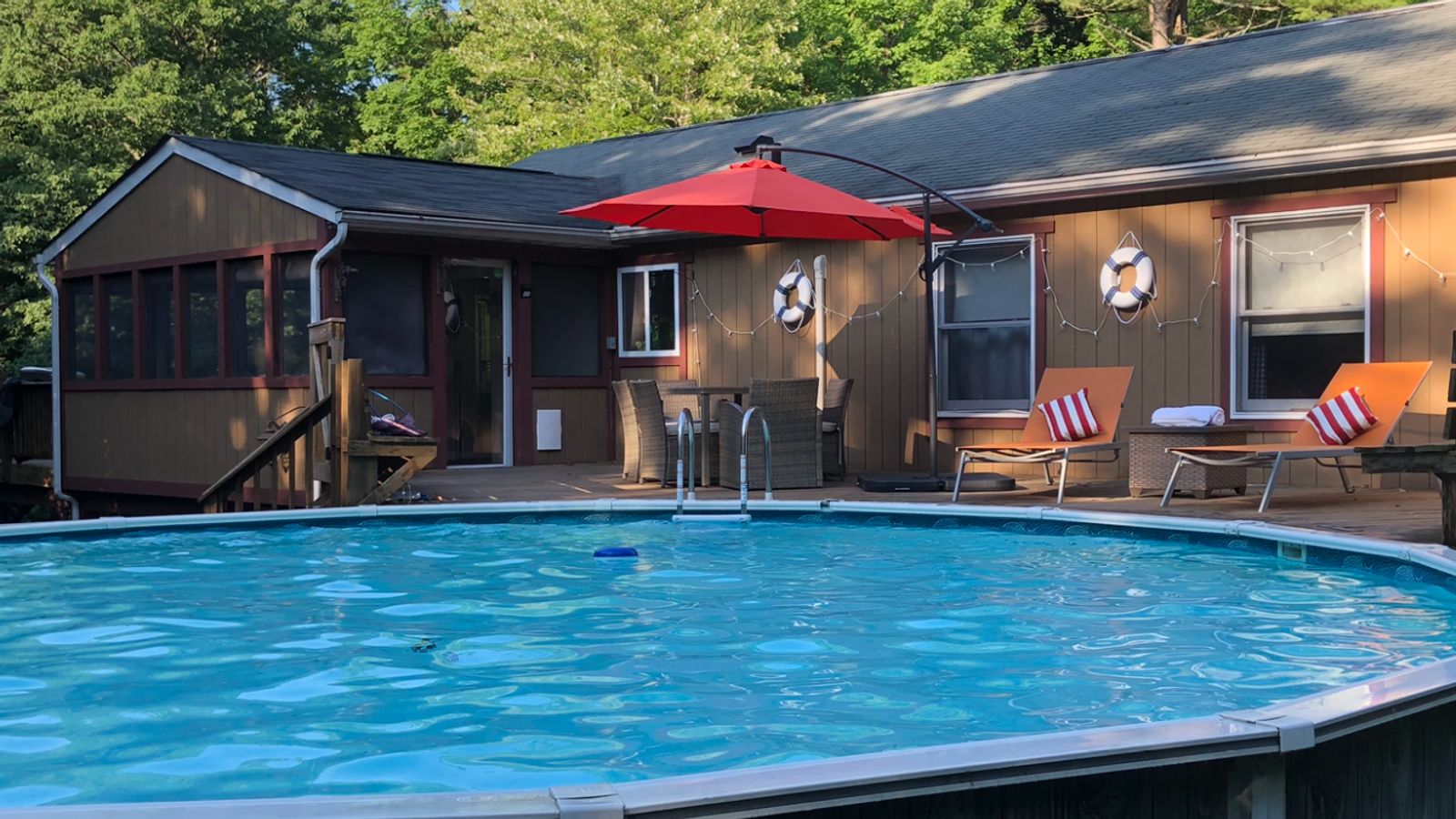OUTDOOR SPACE: The house offers everything you need for year-round entertaining. Features include a wrap-around deck with outdoor lounge area, gas fire pit and screened in porch including an above-ground pool.