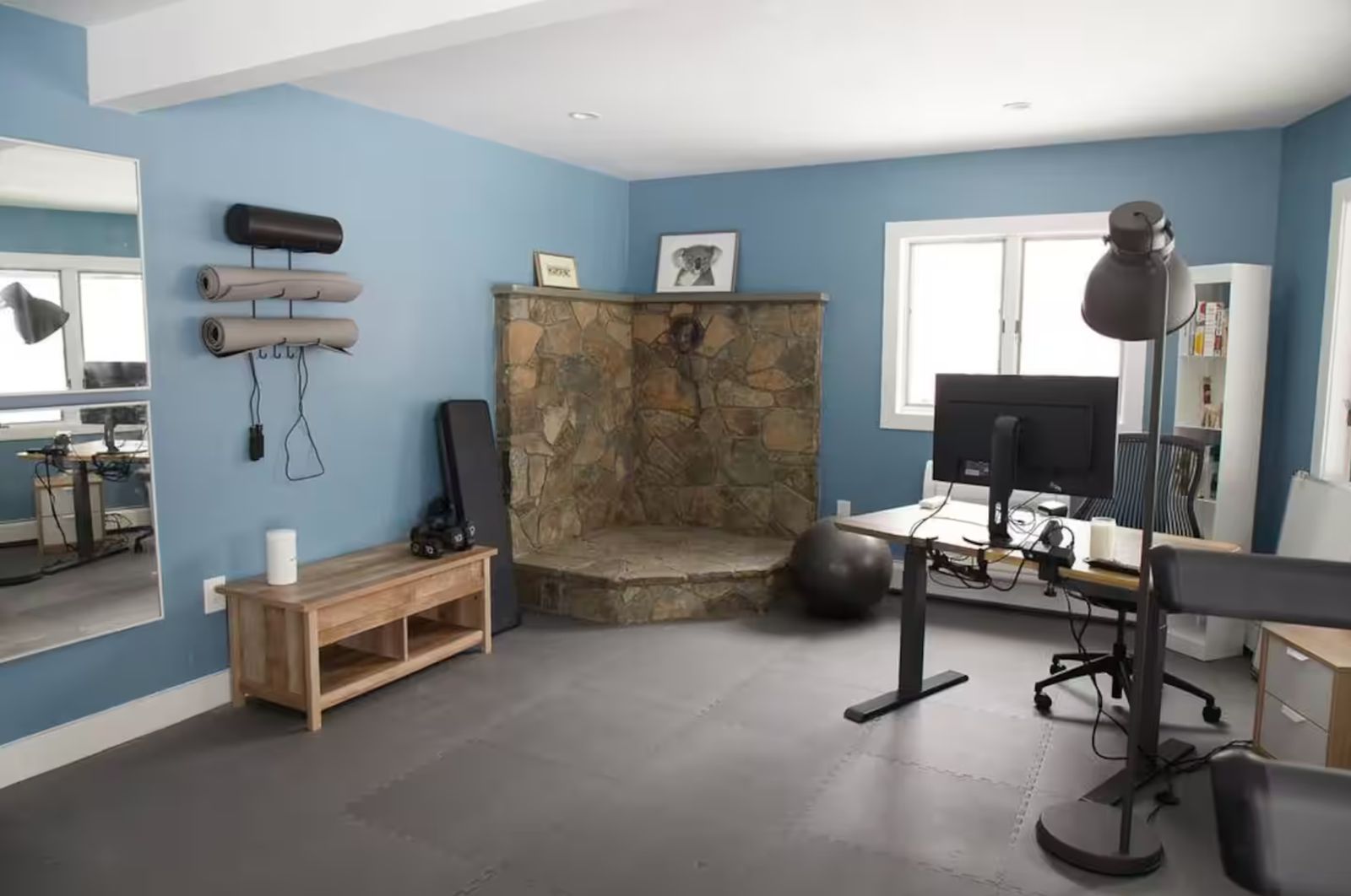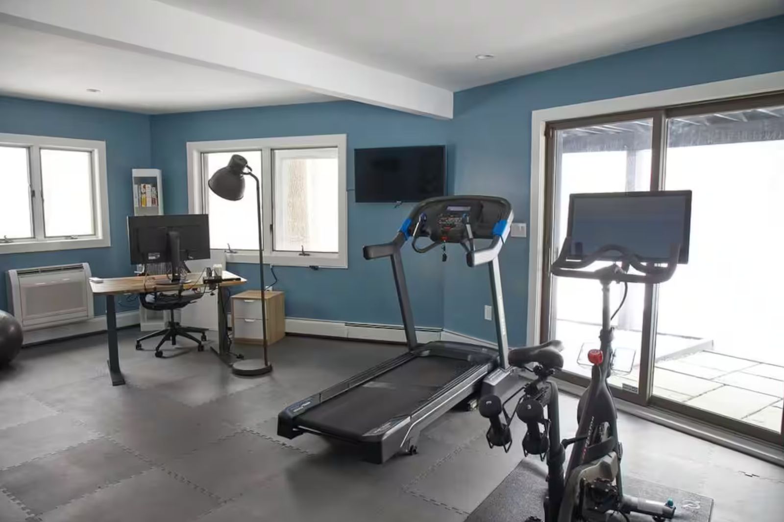 - Gym with a desk workstation, flat-screen TV, Peloton Bike, treadmill, yoga mats, and exercise ball