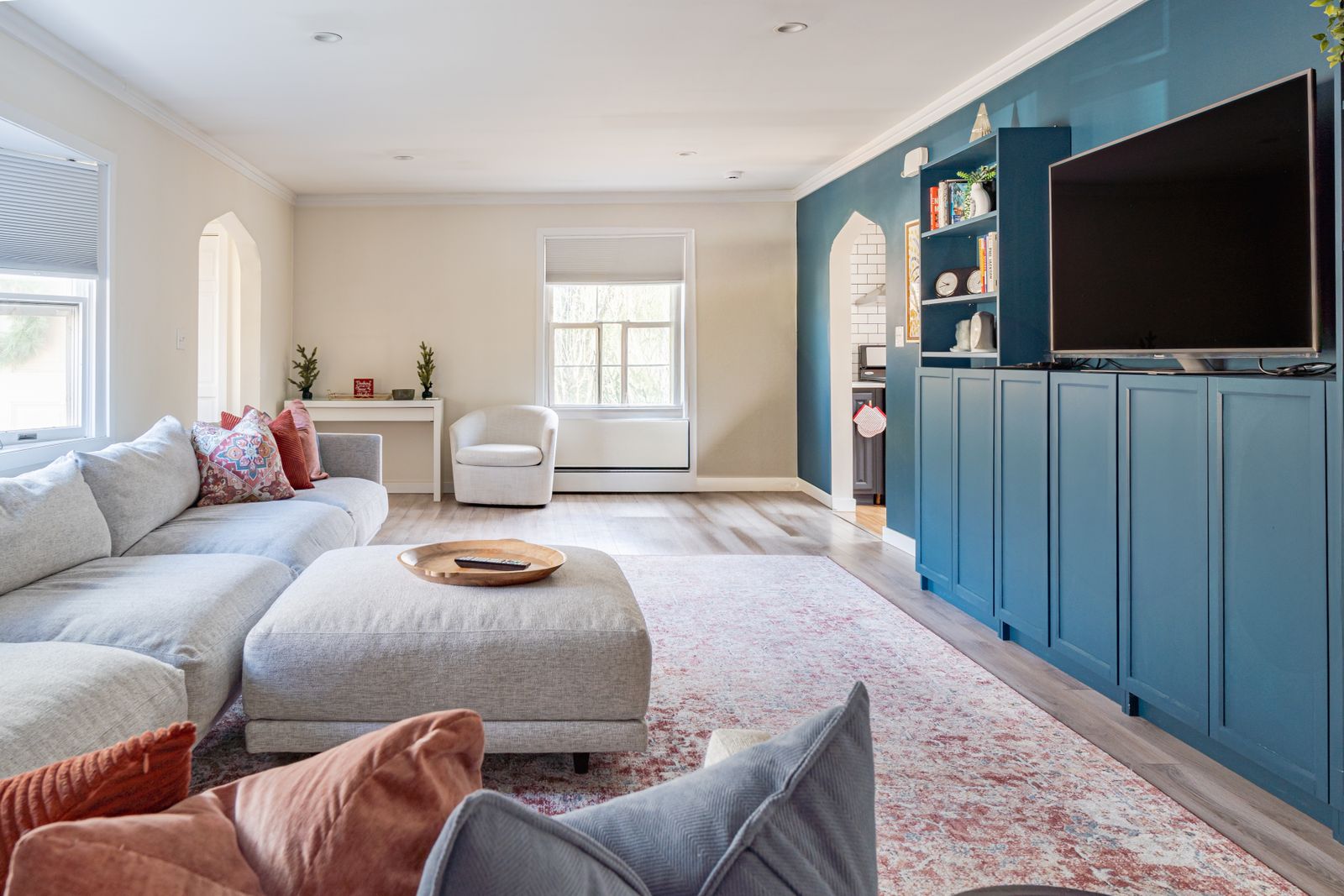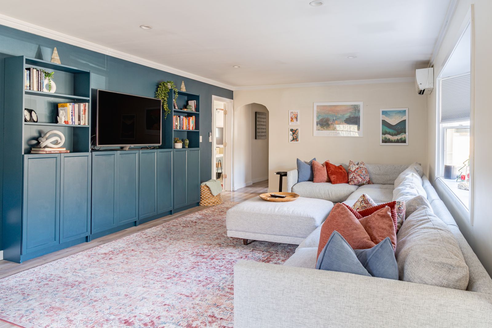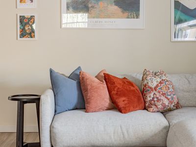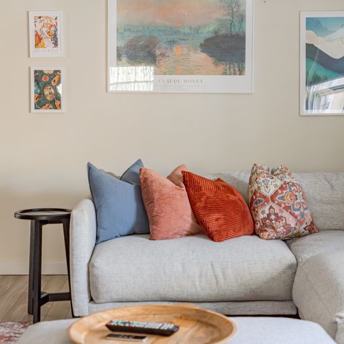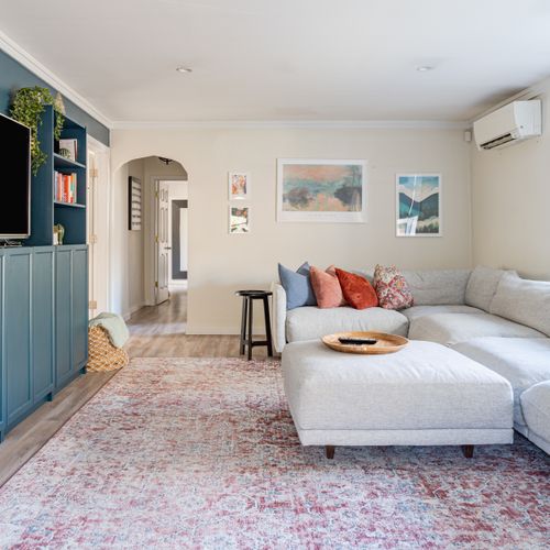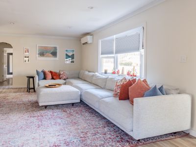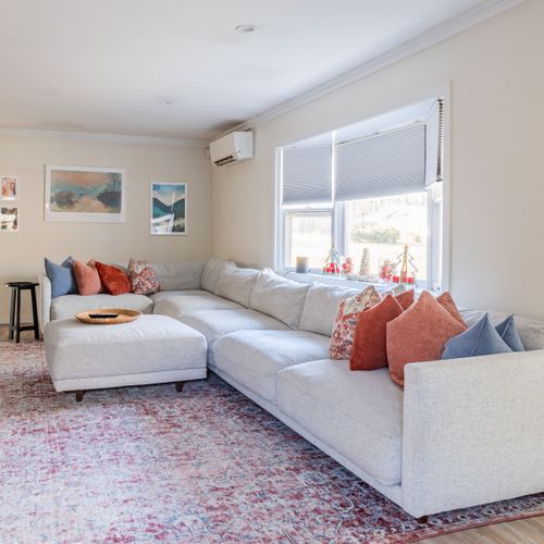 A smartly decorated living room with Smart TV (Apple TV access) and working areas as well as an extra large section couch.