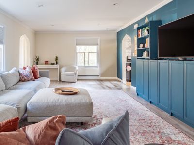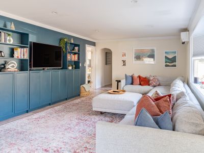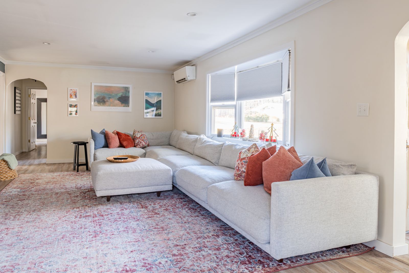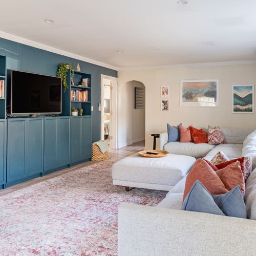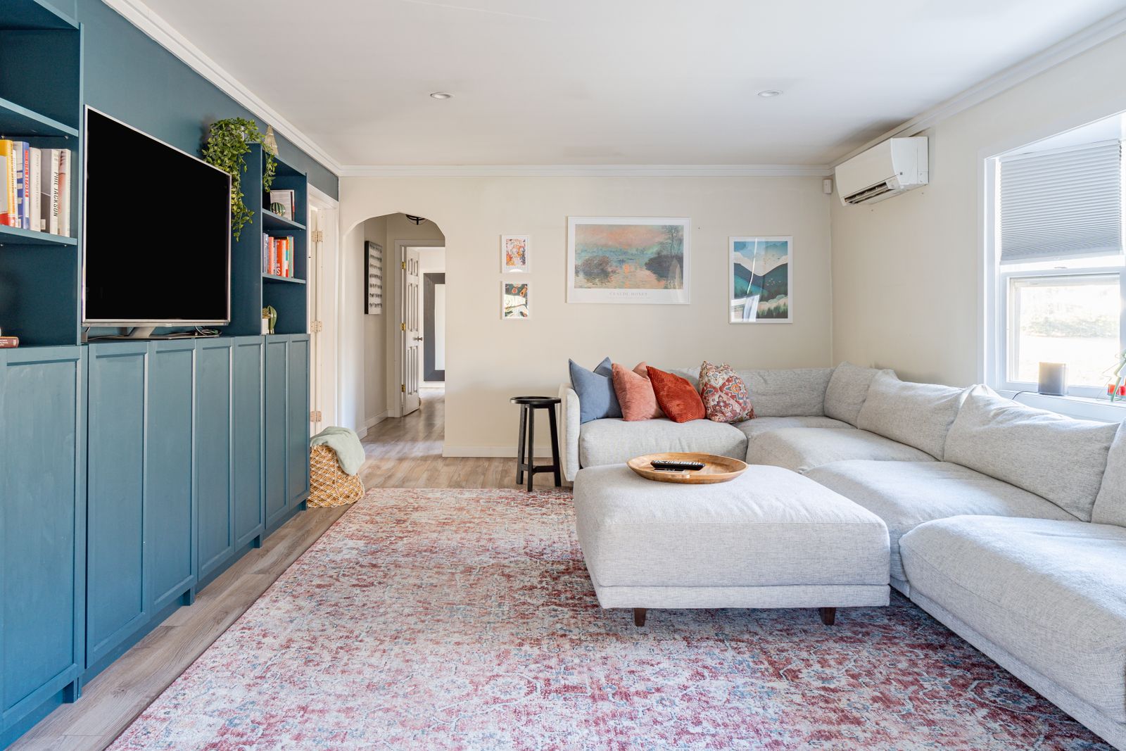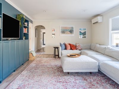 A smartly decorated living room with Smart TV (Apple TV access) and working areas as well as an extra large section couch.