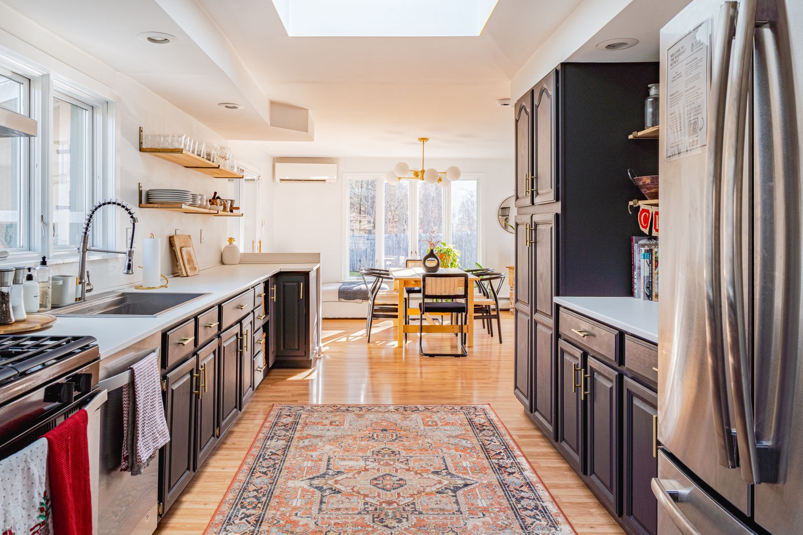 The kitchen features ample counter space, stainless steel appliances including a gas stove and dishwasher. The adjacent dining room overlooks the backyard and has sliding doors to the screened in porch.