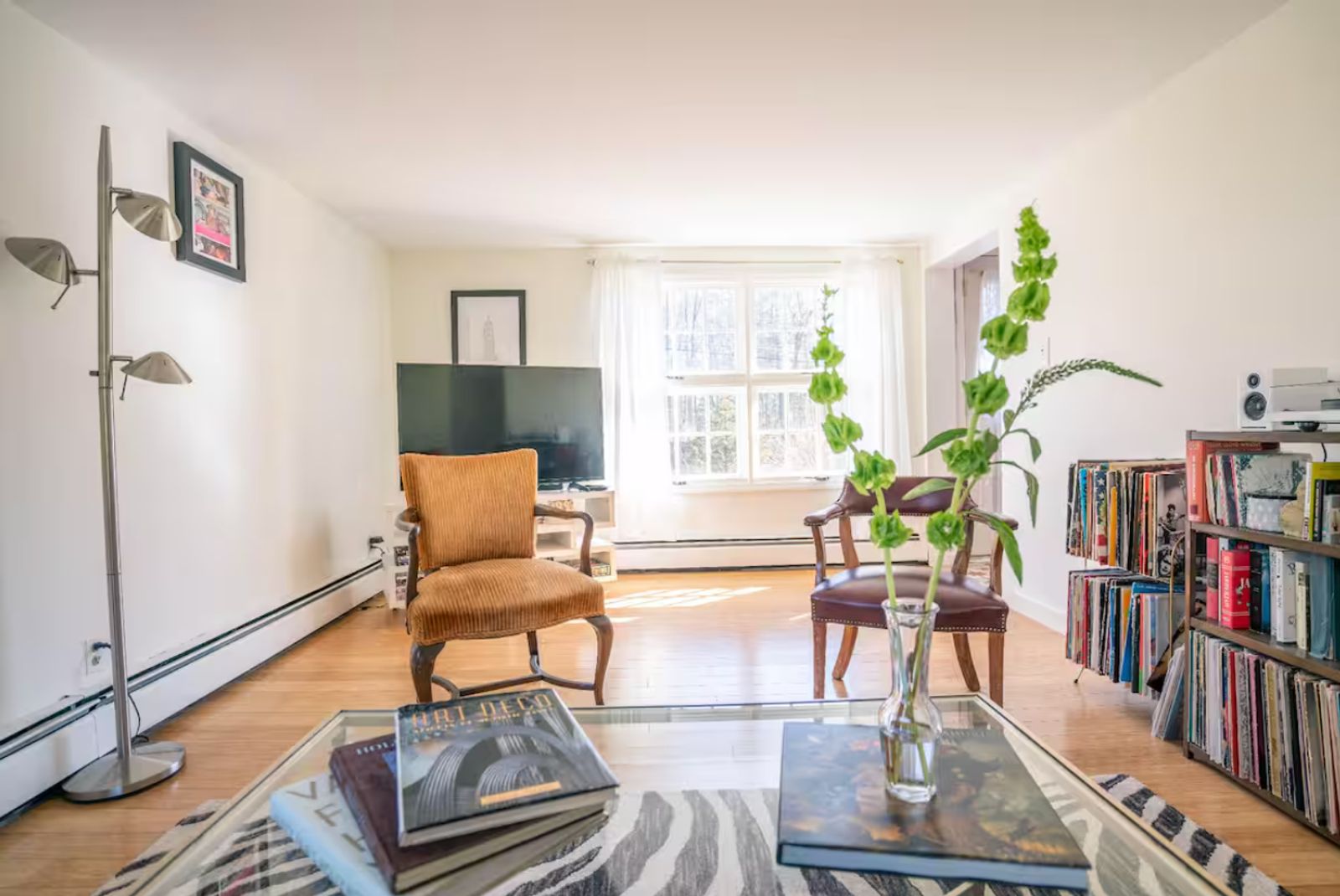 The living room includes a Smart TV (please use your own credentials for streaming services) as well as a record player with a collection of music for your enjoyment.