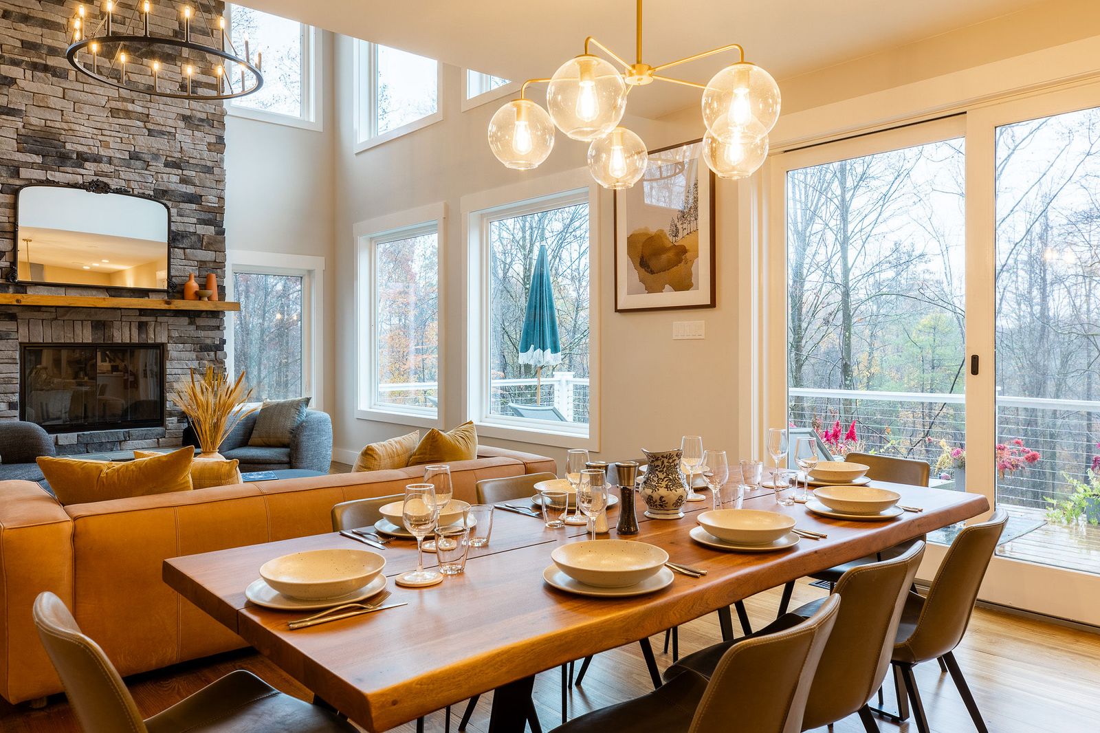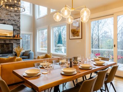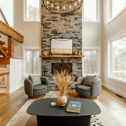 The living room is anchored by enormous windows that shower the room with light and views of the surrounding greenery. The room, with its double stacked windows features a wood-burning fireplace and comfortable seating to gather around and enjoy.