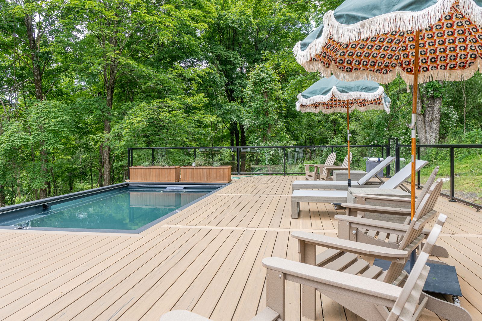 Outside, there is a Weber gas grill available, outdoor seating and a firepit with Adirondack chairs. The Modpool is made from a shipping container with aquarium glass on one side.